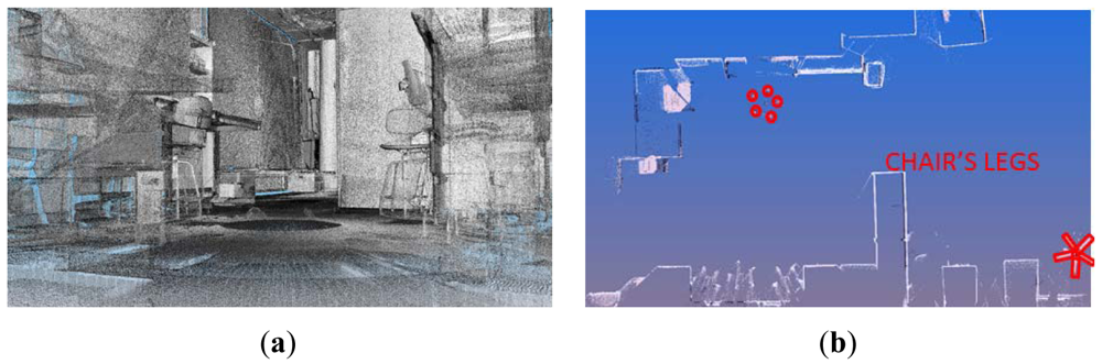 As regards the chairs, the data gathered by the RFID sensor provide information about the separation between the legs. The pattern of the chair legs is searched in a slice of points near to the floor. As in the previous case, the slice of points is transformed into an image in which 2D matching algorithms can be applied. The pattern to be matched in the image consists of a group of 3, 4 or 5 dots, or of a starry form of 3, 4 or 5 arms. These patterns can be easily identified by using cross correlation algorithms [46], matching the image with the models stored in our database. Figure 9 shows an example in which two types of chair patterns have been identified and marked in the scene. The accurate 3D position in the scene model of a detected chair pattern is again computed with an ICP algorithm. Owing to possible ambiguities in the correspondence of points, a fast test based on a least squares method is carried out to discard those which are erroneous.