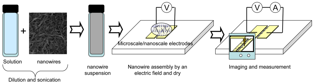 Figure 1 shows common procedure for nanowire assembly using an electric field. Synthesized nanowires are diluted in a solvent. A drop of the suspension is placed on microscale- and nanoscale electrodes where an electric field is applied. The nanowires in the solution are attracted and assembled on the electrodes. After the assembly, the solvent is evaporated in air. In the case of heavy molecular weight solvents, the solvent is removed at high temperature. The assembled nanowires are then characterized by microscopy and electrical measurement.