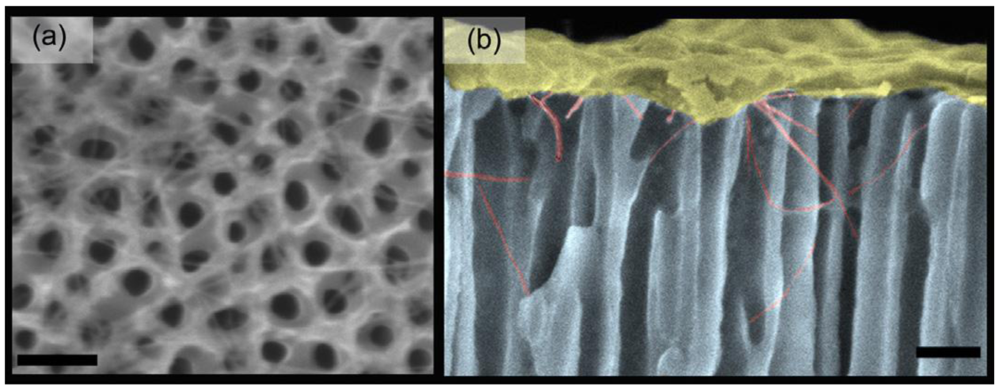 CNTs have also been recently used to create three-dimensional (3D) nanostructures by several different fabrication techniques. In one technique, electric fields have been used in conjunction with nanostructured templates, made out of anodic aluminum oxide, to direct the growth of large-scale 3D CNT structures (Figure 10) [108]. These nanotemplates have vertical nanoscale cylindrical holes that can be used to assemble SWCNTs, which can be useful in various assembly applications. Also, 3D CMOS devices have been assembled by another fabrication technique that includes optical lithography, lift-off, and dielectrophoresis [109].