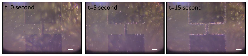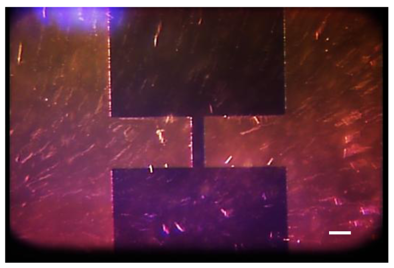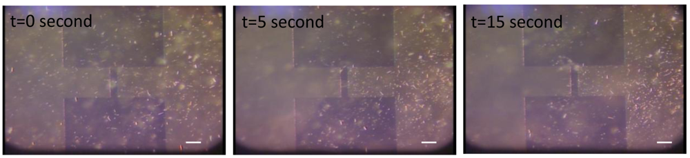 For the electroosmosis observation, 10 μL solution containing Si nanowires were placed on planar electrodes. The rotation of Si nanowires was observed due to the electroosmotic flow (Figure 6). The electric potential was 4 Vpp at 100 Hz. The electroosmotic flow can attract nanowires in the vicinity of electrodes by circulation flows, which is much more effective than DEP. However, the random characteristic of the flow can be detrimental to precise assembly of nanowires. The attraction of ions can damage the surface of nanowires and electrodes.