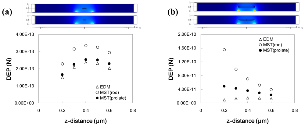 The height of a nanowire from the electrode surface was varied. For the EDM method, the particle shape assumed was a prolate particle because of the limitation of the analytical expression. For the MST method, both prolate and cylindrical shaped particles were considered. Thus, the particle shape is identical for the prolate particles of EDM and MST. Nanowires of different particle sizes (L/H = 0.5/2 and 2/2; L: length of nanowire, H: gap between electrodes) with the same aspect ratio (D/L = 0.05/0.5 and 0.2/2; D: diameter of nanowire) were used for the comparison. Comparing Figure 3(a) and Figure 3(b), the computed DEP forces for the EDM and MST methods are quite different. Also the DEP forces vary according to the shape change because the surface charge on the particles varies.