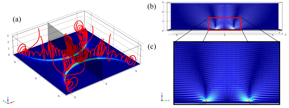 When electric potential is applied to electrodes in a solution, ions are attracted to charged electrodes due to electrostatic interaction. The ions above an electrical double layer are not firmly anchored to the surface due to the electrical screening effect of the first layer. The ion concentration of this diffuse layer is changed along the variation of an electric field at the edge of electrodes. The decay of an electric field from the edge to the electrode surface is exponential, which induces ionic motion. The electroosmotic flow for a DC electric field can be calculated by [45]:
