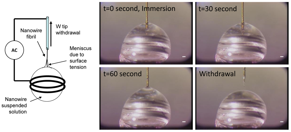 One-dimensional assembly [82,83] is used to produce a tip, a fibril, or a fiber made of nanowires by combining an electric field and capillary action. Figure 8 shows a one-dimensional assembly process. Gold plated tungsten (W)-tip 50 μm in diameter was immersed in a DMF solution containing Si nanowires. An electric field of 20 Vpp at 5 MHz was applied to the W-tip and the ring that held a 2 μL solution drop. After 1 minute of immersion time, the W-tip was withdrawn gently from the drop. Due to dielectrophoretic attraction and capillary action, a small fibril was formed at the end of the W-tip, which is one-dimensional assembly.