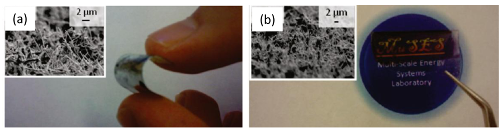 Thin films of perpendicularly aligned CNTs have also been investigated for the distinct properties. High voltage electrophoretic deposition (HVEPD) can also be used to create high-quality, low deposition-time films [98,99]. HVEPD attracts and attaches CNTs perpendicular to an electrode surface through high voltage electrophoresis [98]. To decrease aggregation, a low concentration of nanotubes can be used [99]. After electrophoretic alignment, one group used ultrasonic irradiation to reassemble the nanotube bundles into a more precise organization [98]. The factors that influence HVEPD are the gap size between the two electrodes [98], concentration of nanotubes [99], deposition time [99], and the strength of the electric field [98]. It was also noted that short CNTs are more useful because they are easier to manipulate [98]. These thin films can be assembled on a variety of substrates including transparent, flexible, and stretchable materials, in addition to metal (Figure 9).