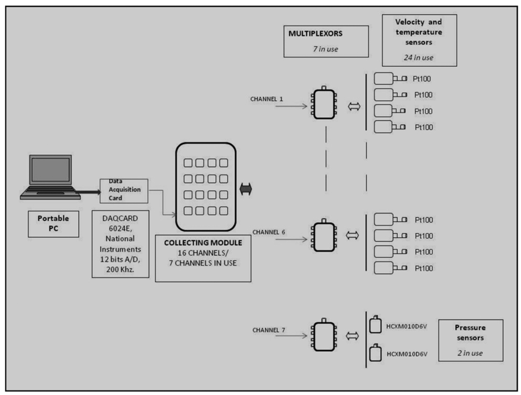 A configurable multi-sensor device aimed at measuring air velocity, temperature and differential pressure in multiple locations at the same time was designed and built. The system consisted in a portable PC (Pentium III, 64 Mb RAM) and a National Instruments Corporation (Austin, TX, USA) DAQCARD 6024E data acquisition card with 16 analogue inputs and a maximum sampling rate of 200 kS/s. Its absolute accuracy at full scale was 10.568 mV. As 16 channels were less than those needed, a central multiplexor data collection module was designed. The multiplexing modules were able to concentrate eight signals into a single channel. Therefore, the system extended the 16 channels of the acquisition card to a maximum of 128 signals. To reduce interferences, all information was sent in current mode instead of voltage mode. The card also had eight digital input-output channels, which were used to control multiplexing units.