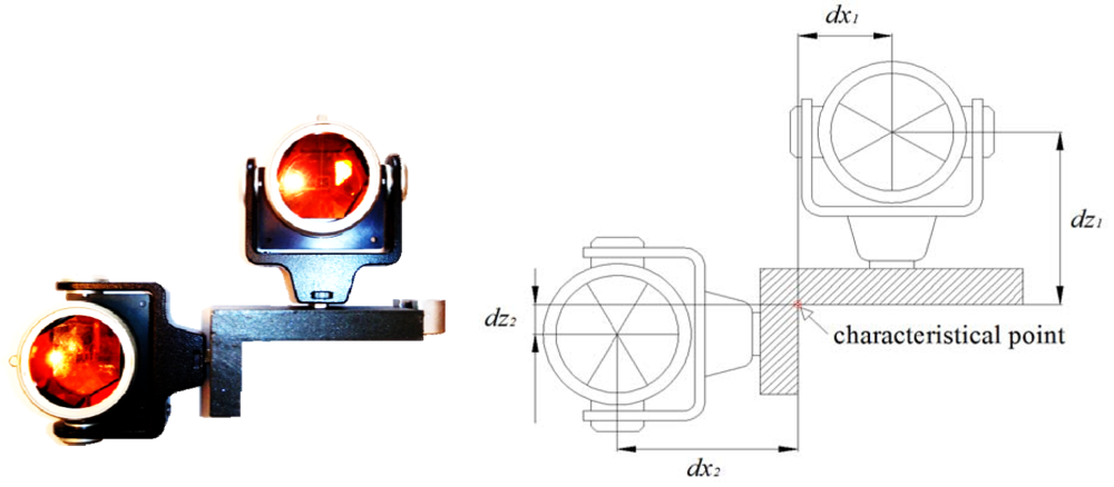 Each setting of the platform onto a crane rail provides us with two prism center points. We want to represent each setting with one characteristical point. The position of a characteristic point is shown in Figure 1. The centers of measuring prisms are uniquely determinable. The centers of the prisms and the characteristic point lie in the common vertical plane. The coordinate system is defined in such a way that it allows the computation of the characteristic point using the upper prism:
