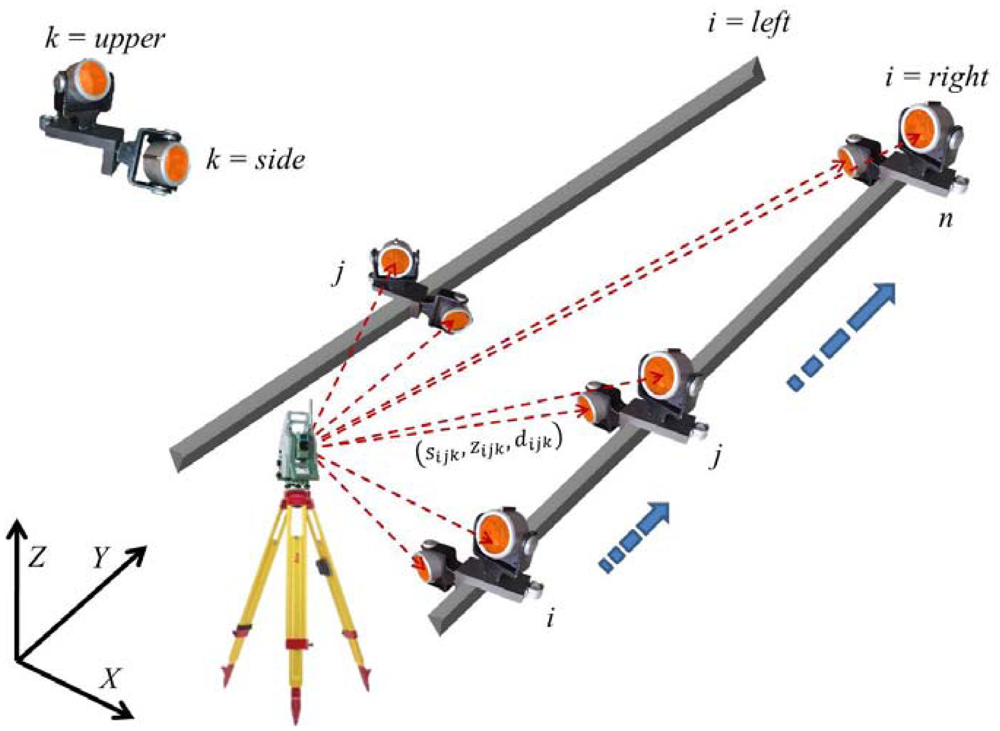The results of the polar surveying method (Figure 3) are the horizontal directions sijkl, zenith angles zijkl and slope distances dijkl, where i denotes the left or the right rail, j a consecutive point on the rail or profile, k the upper or side prism on the platform, and l the consecutive measurement in each setting of the platform.