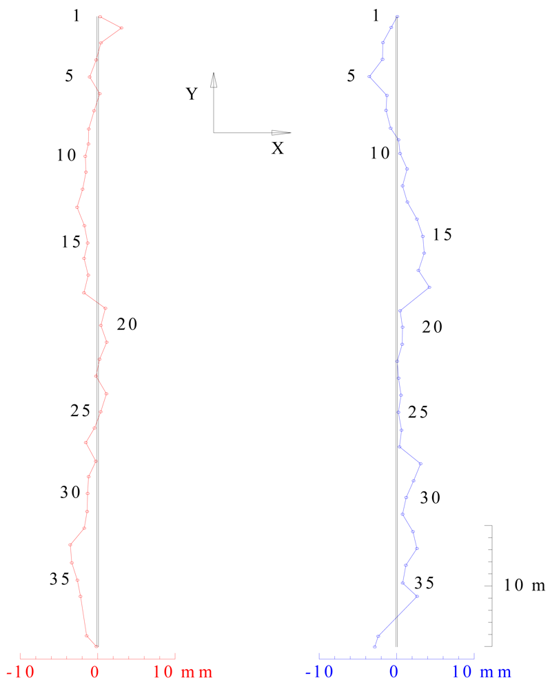 It is evident that the deviations are within the tolerances prescribed by the standard (10 mm). Results can be represented graphically as shown in Figure 4.