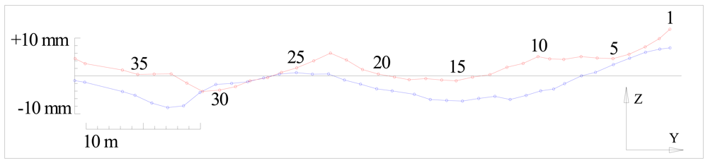 It is evident that the height differences between the left and the right rail are within the tolerances prescribed by the standard (). (Δhmax = 32.2mm) Results can be represented graphically as shown in Figure 5.