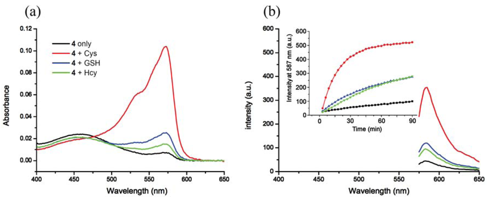 In buffer without a surfactant, as expected, 4 shows excellent selectivity towards Cys due to the reported kinetically favored 7-membered ring formation. Upon mixing Cys with 4, the conjugate addition product 4a is formed, which undergoes a rapid cyclization reaction to produce 3a while releasing the free resorufin (Scheme 3). A significant color change and fluorescence enhancement can be observed in response to Cys (Figure 1). In the case of Hcy, because it has an additional methylene group in its side chain, a kinetically less favored 8-membered ring would form. As for GSH, 1,4-addition of thiols to the α,β-unsaturated carbonyl moieties of 4 can occur readily; however, the ensuing intramolecular cyclization similar to that of Cys cannot proceed without the presence of surfactant. No significant color formation or fluorescence response is seen in the case of Hcy or GSH under these conditions.