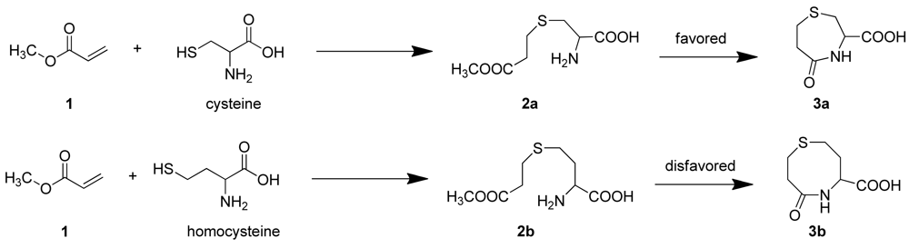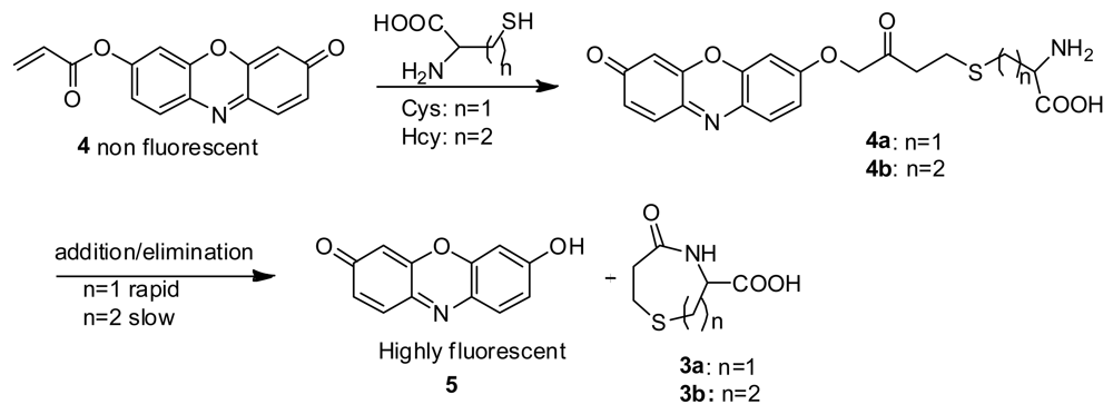 It has been reported that Cys reacts with acrylates to generate thioethers that undergo an intramolecular cyclization reaction to yield, for example, 3-carboxy-5-oxoperhydro-1,4-thiazepine (3a) [11]. In the case of Hcy, 2b should be easily obtained [12], however, the intramolecular cyclization reaction to form a eight-membered ring (3b) is kinetically disfavored, compared with the formation of seven membered ring (3a) which would result from Cys (Scheme 1) [13–15].