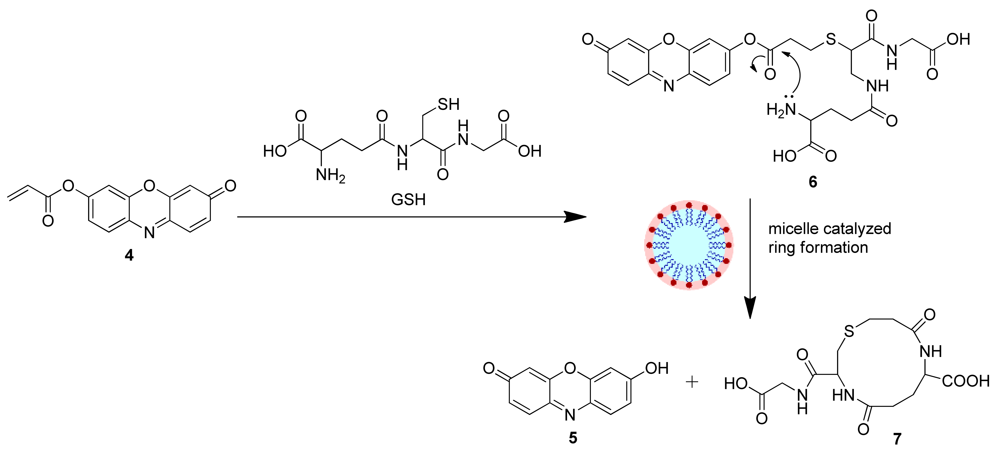 Based on the above results, we propose a plausible mechanism for the GSH selectivity of the 4-CTAB system that involves the conjugate addition of GSH to 4 to generate 6, which in turn undergoes an intramolecular cyclization/elimination reaction sequence catalyzed by the CTAB micelle releasing the free resorufin dye (Scheme 4), resulting in the recovery of the fluorescence. Formation of the 12-membered ring (7) and the free resorufin dye were further investigated via HRMS (See Figures S10, S11 in the Electronic Supplementary Information).