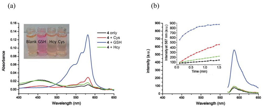 Inclusion of surfactants (see Figure 2) dramatically alters the intrinsic selectivity of 4. For example, solutions of GSH, Cys and Hcy (2 equiv) with the resorufin-acrylate probe 4 in pH 7.4 phosphate buffer generate the characteristic strong pink color immediately upon addition of CTAB only in the presence of GSH (Figure 3(a)). Other amino acids, such as Hcy and Cys, did not exhibit significant changes under the same conditions. This interesting feature indicates that 4-CTAB system can serve as a selective visual inspection dosimeter for GSH. Corresponding fluorescence increases were also observed (Figure 3(b)). Fluorescence upon reaction with GSH reaches a plateau in less than 2 min.