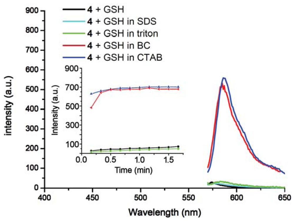 However, to achieve the highly selective detection of GSH over Cys and Hcy, one would need to overcome the formidable challenge of favoring the formation of a larger (12-membered ring in the case of GSH) over a 7- and 8-membered ring (as in 3a and 3b). Interestingly, it had been reported earlier that cetyltrimethylammonium bromide (CTAB) micelles can catalyze the intramolecular ring closure of larger rings, reversing the expected kinetics based on ring size [18]. It is also known that GSH binds the surface of cationic CTAB micelle [19]. We reasoned that a relatively smaller and more planar dye as compared to the HMBT and SNF probes used previously may interact more with the micelle and thus promote highly selective detection of GSH [20]. We thus herein report the successful use of a resorufin-based probe for the highly selective detection of GSH in CTAB medium.