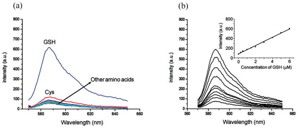 To further evaluate the selectivity of the 4-CTAB system towards GSH, control experiments using a series of other amino acids were performed measuring the fluorescence responses. Other amino acids produced no significant fluorescence enhancement as compared to GSH, further demonstrating the excellent selectivity for GSH (Figure 5(a)). Moreover, significant fluorescence enhancement can still be observed for GSH even in the presence of excess Cys (see Figure S9 in the Electronic Supplementary Information). Additionally, the fluorescence enhancement of the 4-CTAB system displayed submicromolar sensitivity and a linear relationship with the concentration of GSH over a wide range (Figure 5(b)). The system functions well within the range of typical GSH concentrations in human plasma [21].
