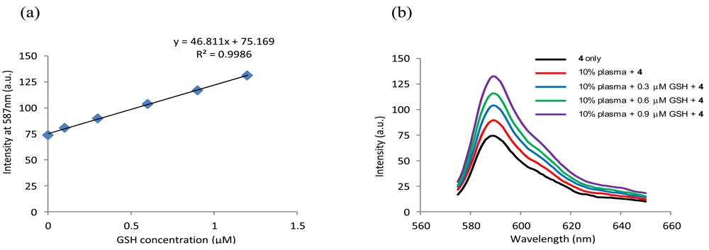 The detection of GSH was performed in 10% deproteinized human plasma. Plasma proteins were precipitated using MeCN (two thirds of the reconstitution volume) and removed by centrifugation at 4,000 rpm for 30 min. The supernatant liquid was diluted [23] and added to a solution of 4 (1 μM) in phosphate buffer (pH 6, 50 mM) in the presence of 2.0 mM CTAB. The fluorescence response of replicate (n = 3) samples and GSH spiked samples were monitored as above and the GSH content in the plasma sample was determined from the regression equation of a standard calibration curve (Figure 7). The GSH content of the plasma sample was determined to be 3.24 ± 0.14 μM, which is well within the reported GSH concentration range for human plasma samples from healthy individuals [21]. Recoveries of the known spiked amounts of GSH were between 99.2% and 102.3% with a generally satisfactory precision (Table 1). These results revealed the potential applicability and reliability of using 4 in quantitative detection of GSH in human plasma. In addition, Cys exhibited significant interference with the GSH determination (See Figure S13 in the Electronic Supplementary Information).