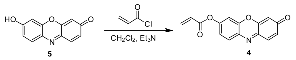 Probe 4 was synthesized in a one-step reaction of resorufin with acryloyl chloride (Scheme 2). To a solution of resorufin (220 mg) and Et3N (1.5 equiv) in 15 mL of anhydrous CH2Cl2, acryloyl chloride (2.0 equiv in 5 mL of CH2Cl2) is added dropwise at 0 °C. After stirring at this temperature for 60 min, the resulting mixture is allowed to cool to room temperature and stirred overnight. The mixture is diluted with CH2Cl2 (20 mL), washed with H2O (10 mL × 3) and dried over anhydrous Na2SO4. The solvent is removed by evaporation to afford an orange solid (172 mg, 70% yield). 1H NMR (CDCl3, 400 MHz), δ (ppm): 7.92 (d, 1H, J = 8.7 Hz), 7.59 (d, 1H, J = 9.8 Hz), 7.49 (s, 1H), 7.33 (dd, 1H, J1 = 2.4 Hz, J2 = 2.5 Hz), 6.83 (dd, 1H, J1 = 2.0 Hz, J2 = 2.0 Hz), 6.63 (d, 1H, J = 17.2 Hz), 6.49 (m, 1H), 6.24 (s, 1H), 6.22 (d, 1H, J = 1.0 Hz). 13C NMR (CDCl3, 100 MHz), δ 186.48, 163.84, 153.24, 148.87, 147.78, 143.55, 134.85, 134.26, 134.15, 131.22, 131.16, 127.18, 118.82, 109.94, 105.86. ESI-MS m/z = 268.0833 [M+H]+, calc. 268.0810 for C15H10NO4.