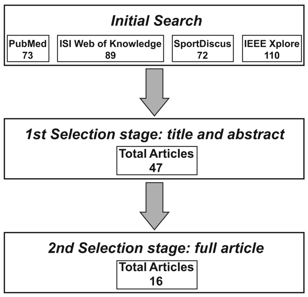 The research method is graphically depicted in Figure 2 for better understanding of the procedure. We systematically searched for published journal articles and papers in proceedings in PubMed (from 1950), ISI Web of Knowledge (Science Citation Index Expanded, from 1899; Social Sciences Citation Index, from 1956; Art & Humanities Citation Index, from 1975), SportDiscus (from 1950) and IEEE Xplore (from 1950) at the first week of July in the year 2011. These four electronic engines/databases were chosen because of their popularity and their coverage of literature in engineering, medicine and biomechanics. The searched keyword string was “(assessment OR estimation OR calculation OR computation OR measurement) AND (inertial sensor OR accelerometer OR gyroscope OR inertial measurement unit) AND (speed OR velocity OR step length OR stride velocity OR stride length) AND (walking)” for appearance in the title, abstract and keyword fields of the articles. The initial total number of identified articles was 344. The title and the abstract of each article was read carefully for the first selection stage, and unrelated and duplicated articles were excluded, which reduced the number of articles to 47. In the second selection stage, these 47 full articles were retrieved from the Queen's University library system and completely reviewed. A total of 16 full articles were ultimately included in this review. The inclusion criteria were as follows: (1) the study involved inertial sensors, and (2) the study reported walking speed, stride length or walking distance estimation results. However, as this review focuses on the method development, articles only containing the following contents were excluded: (1) performance evaluation of a commercial available product without revealing the walking speed estimation method, (2) performance comparison between existing methods, and (3) applications based on previous reported methods.