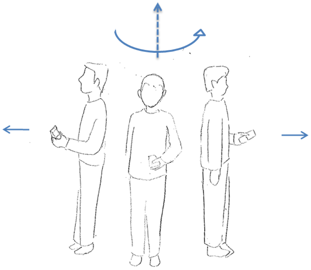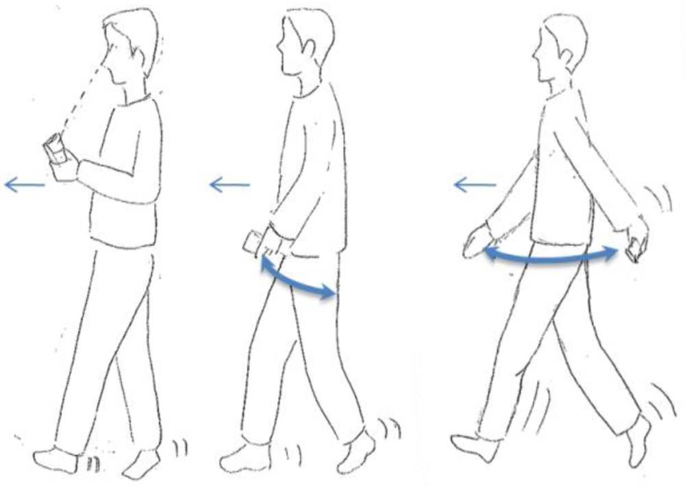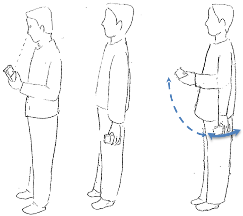 Figure 1. S-series (left and middle: ST, right: SS).W-series is relevant to walking. After observing the walking behaviour of the user when navigating, three types of walking motion states have been defined. As shown in the left image of Figure 2, WH represents the motion state where the user is using the navigation application on the handset while walking. The user often keeps his or her eyes on the screen of a smartphone in this state. WS stands for the normal walking behaviour, when the user is not using the navigation application but is holding the smartphone in his or her hand. As the center image of Figure 2 indicates, a small arm swinging motion exists when the user is walking in normal speed, while the right image of Figure 2 shows the WF state, which represents a fast walking behaviour with significantly arm swinging.