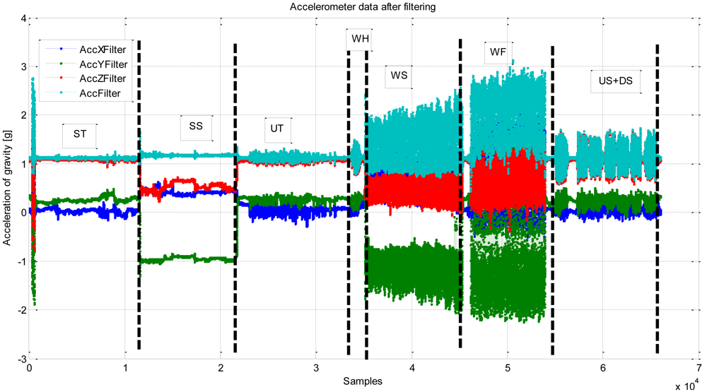 When using tri-axis accelerometer sensors, the sensor orientation determines the local coordinate system of each (x, y, z) reading. Most previous research work on motion recognition has used body-worn accelerometer sensors, i.e., sensors attached to the body in a constrained orientation. When smartphones are used as portable sensors, the orientation of the sensors is not known a priori. Figure 5 gives a typical example of the accelerometer readings after filtering from a smartphone while different motion states are performed.