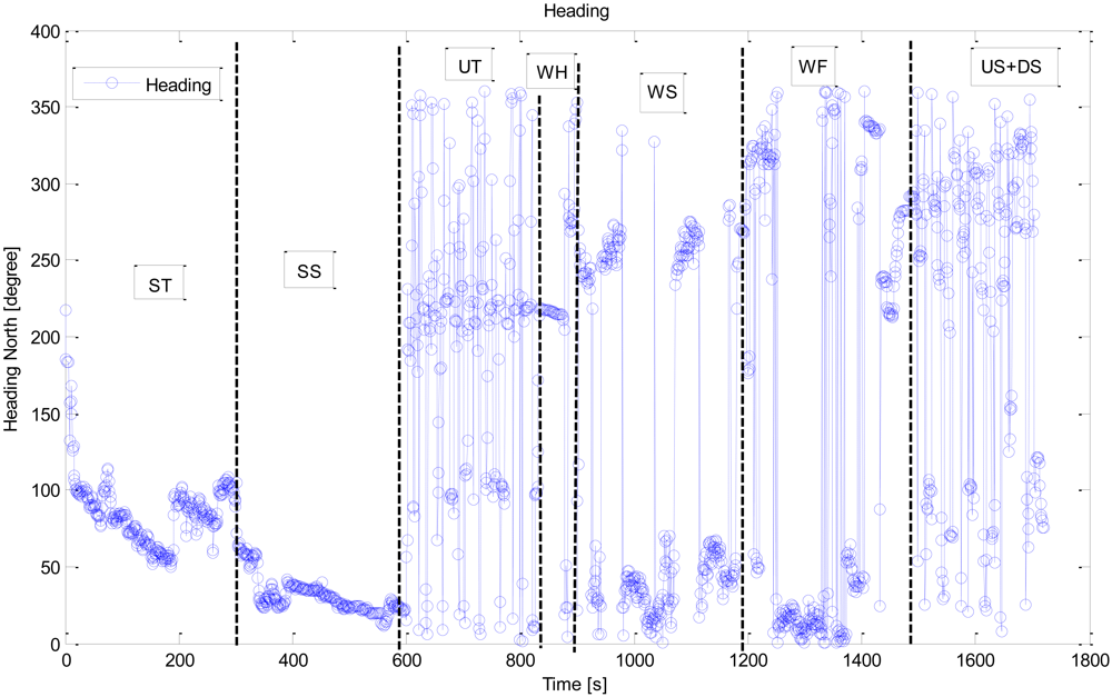 In addition to the accelerometer sensors, a magnetometer, also known as a digital compass, is another data source that can be utilized for motion recognition in a smartphone. The magnetometer, however, has some significant drawbacks. Indeed, magnetic disturbances are numerous, particularly in indoor environments. Figure 6 shows the corresponding heading readings from a built-in magnetometer for the same example readings presented above in Figure 5. Even though the user was in the ST state (0–200 s), the mean error introduced during this time period is still more than 20°. This large level of error means the magnetometer readings cannot be used directly for positioning in indoor navigation applications. Filtering and map matching are always demanded in the practical application. Instead of using the heading readings for navigation directly, in this paper we focus on applying them for recognizing the motion state of the user.