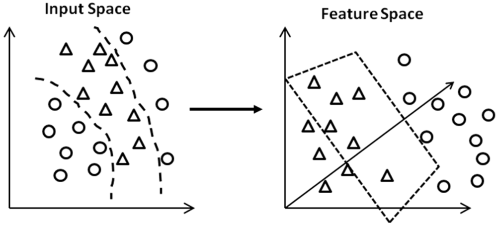 The concept of SVMs, which was originally developed for binary classification problems, is the use of hyperplanes to define decision boundaries separating data points of different classes. SVMs are able to handle both simple, linear classification tasks, as well as more complex, i.e., nonlinear, classification problems [41]. The idea behind SVMs is to map the original data points from the input space to a high dimensional, or even infinite-dimensional, feature space such that the classification problem becomes simpler in the feature space, as shown in Figure 7.