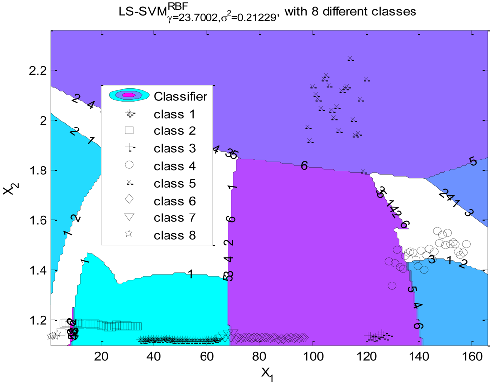 As shown in Figure 8, in this research we label the eight motion states as classes 1 to 8. These states are difficult to separate linearly in the original feature space. In order to classify the states, we apply a LS-SVM classifier using a RBF kernel function. The Nelder-Mead Simplex algorithm [43] is applied for tuning parameter optimization. The cross validation as a cost function is used for estimating the performance of the selected parameters [44]. As the optimized result, the regularization parameter γ equals 23.7002 and the kernel hyperparameter δ2 equals 0.21229. Figure 8 presents the projection of the hyperplanes in the original feature space, which shows that the states are separable in the high dimensional feature space. The accuracy of the LS-SVM classifier for motion recognition will be fully discussed in Section 6.