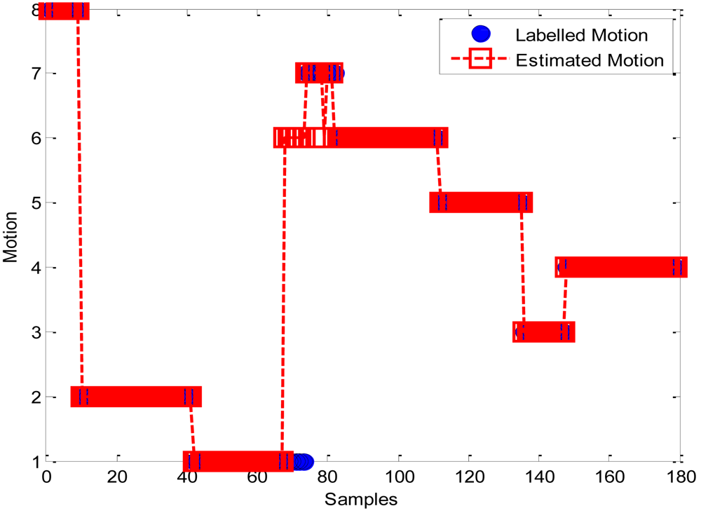 The motion recognition method presented in this paper aims at determining which of the eight motions have caused the above twenty-seven simple features. The possible classification algorithms include k-Nearest Neighbour (kNN), Linear Discriminant Analysis (LDA), Quadratic Discriminant Analysis (QDA), Naïve Bayesian Classifier (NBC), Bayesian Network (BN), Decision Tree (DT), Artificial Neural Networks (ANN), Support Vector Machines (SVMs) and so forth. Thanks to the efficient pattern reorganization performance for the non-linear multi-class scenarios, in this study, we adopt the Least Square-Support Vector Machines (LS-SVM) [40] based classification algorithm, which is a class of kernel-based learning methods widely used for classification and regression analysis.