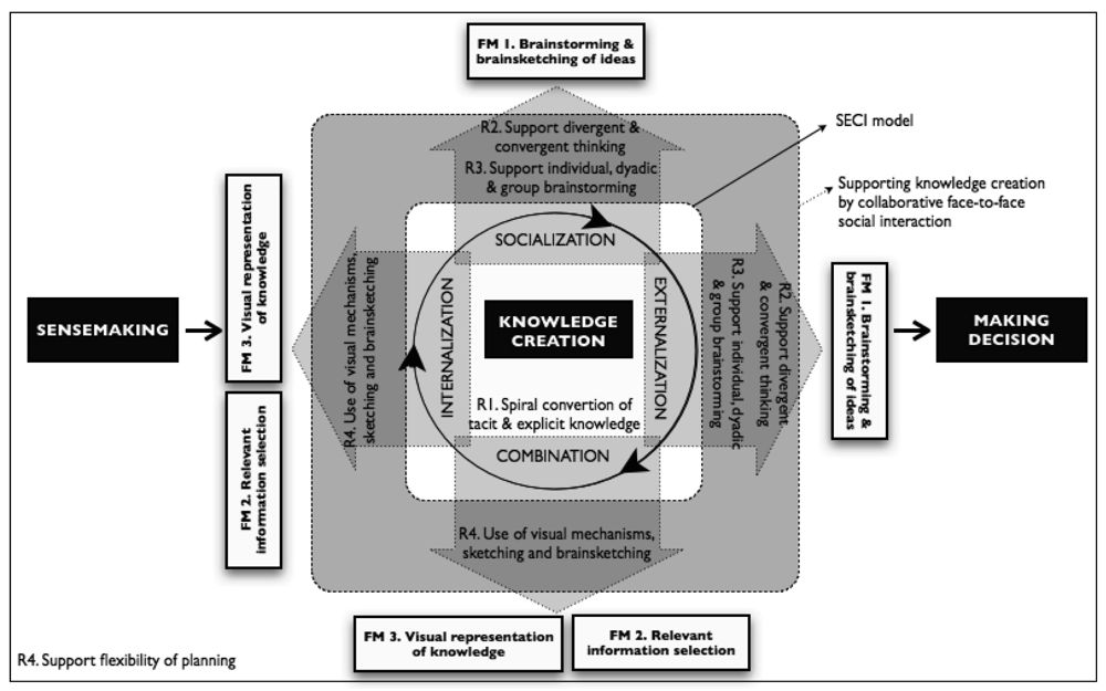 According to Nonaka and Toyama [5], knowledge creation cannot be independent from the individual's own context. Social interaction, spatial, cultural, and historical contexts are important for individuals, because such contexts give the basis to interpret information to create meanings. Furthermore, their knowledge creation theory is conceptualized as a dialectic process where new boundaries are created through the social interaction among people. This dialectic process, driven between tacit and explicit knowledge, is explained by the SECI model as taking place in four processes, socialization, externalization, combination, and internalization [20], which proceed one after another in a spiral way. Therefore, the first requirement we will consider for designing the knowledge creation tool is based on the SECI model of Nonaka and Toyama [5]. The tool should support the spiral conversion of tacit and explicit knowledge, hereinafter also referred to as R1, in which knowledge creation starts with the process of converting tacit knowledge through shared experiences in face-to-face social interaction into explicit knowledge, which is amplified in a spiral way through the four processes of knowledge conversion: socialization, externalization, combination, and internalization.