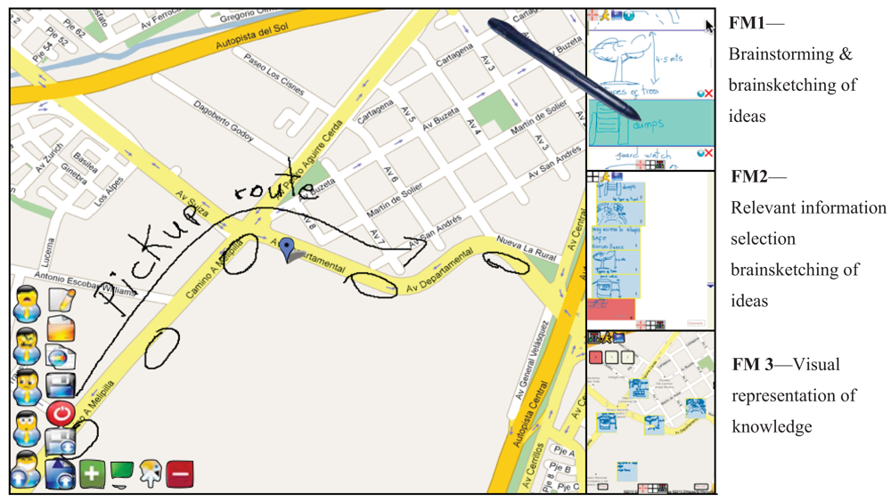 The application allows geo-referencing data and information through the following mechanisms: (1) directly drawing sketches over the map; (2) creation of recursive concepts maps; and (3) creation of localization marks over the map. All these operations are possible while working in any of the three functional modes thus introducing more flexibility to the activity. Thanks to this, the application can be used in various ways allowing participants to (a) collaboratively geo-reference only the necessary information without using any of the three modes, (b) use the FM1 mode (individually, dyadic, or in a group), while associating the geo-referenced sketches and annotations over the map; (c) have a space to express divergences and convergences of ideas using the FM2 mode while referencing the information over the map at the same time; or (d) create a visual presentation of relevant ideas using gestures and sketches using the FM3 mode. In the same way, all three modes can be used independently or combined, according to the users' needs, which fulfils the requirement R4—support flexibility in the granularity of planning. In each mode the interface shows the geo-referenced information on the map.