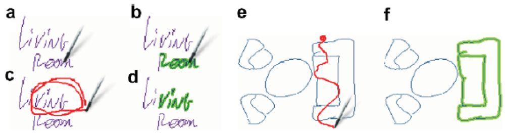 Editing actions are executed using gestures over the working area (map): Selecting sketches is done by any of the following three gestures: The first one consists on clicking with the pen on a given trace or line (see Figure 3(a)), which will select all other traces touching it (Figure 3(b)). The second is to double-surround them with a continuous closed shape (Figure 3(c,d)). This allows the selection of a group of not necessarily connected strokes. The last method is used as an alternative to the double-surrounding and consists of drawing a dense dot and then, without releasing the stylus, drawing a line which touches the different elements that the user wants to select (Figure 3(e,f)). This last method also copies the selected strokes into a clipboard (see Pasting below). The different methods help the user to select of a group of strokes more easily under different scenarios: for instance, double-surrounding is easy and fast for complex drawings (like writing), while dot-selection is faster for selecting strokes in large drawings.