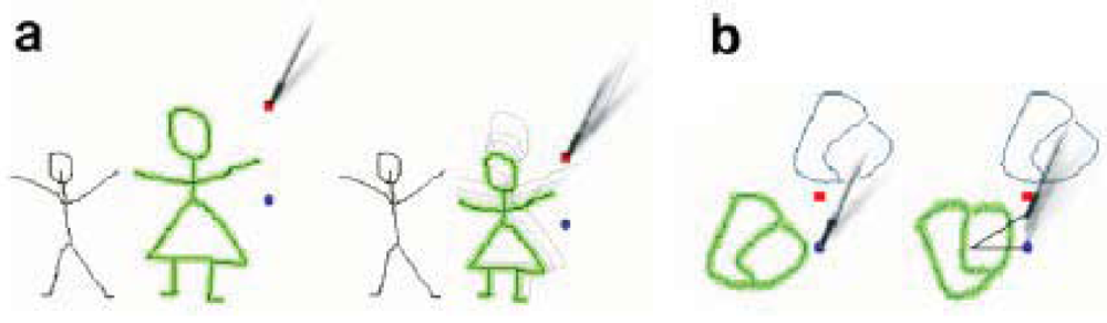 There is a set of simple actions for editing selected shapes: Moving is accomplished by dragging any selected stroke or sketch. Dragging will move the selection as a whole. Resizing is done by dragging the red square handle, located at the upper right corner of the selected group of elements (see Figure 4(a)).