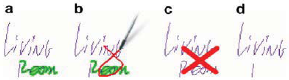 Rotating the selected elements can be achieved by dragging the blue round handle, located at selection's right size (see Figure 4(b)). Removing is performed by drawing a “connected cross” (see Figure 5). If nothing is selected, this gesture removes every touched element. If one or more traces are currently selected, only those elements will be removed. Now we will describe with more detail each of the three implemented working modes.