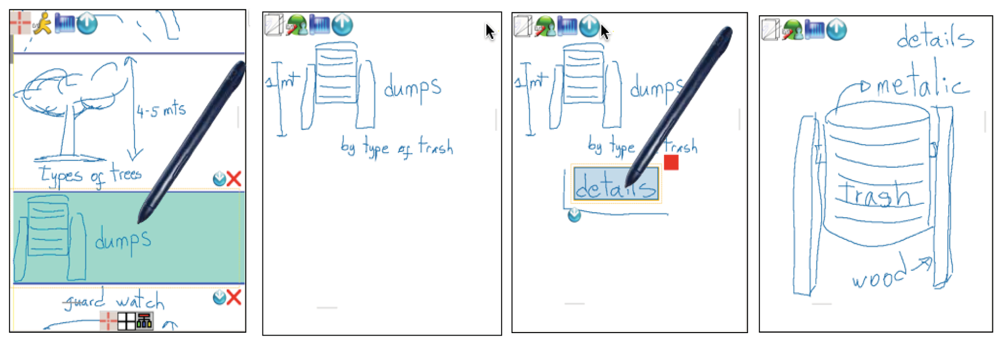 An idea can be collaboratively edited while working in this mode by clicking in the middle area of the rectangle. Collaborative editing allows the socialization of the tacit and explicit knowledge, allowing participants to combine their knowledge and perspectives about the ideas. It is possible to add more information to an idea by means of including concept maps. Concept map's nodes can be created inside an idea by making an “L” gesture enclosing a single or a group of strokes previously drawn (from left to right, see second and third screenshots of Figure 6). Users can get inside of these nodes to include more information as well as to recursively define new nodes, thus creating a hierarchy of nodes. These conceptual maps allow users to organize and add a semantic meaning to the information.