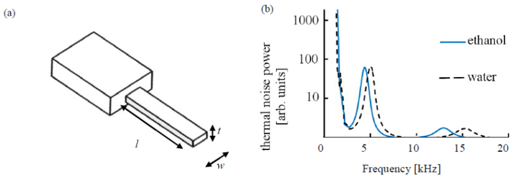 We consider singly clamped rectangular cantilevers of length, l, width, w, and thickness t, oscillating in a viscous medium. The cantilever design and a typical thermal noise measurement are illustrated in Figure 1.
