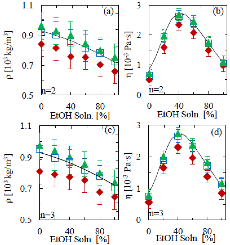 - Soper, A.K.; Dougan, L.; Crain, J.; Finney, J. Excess entropy in alcohol-water solutions: A simple clustering explanation. J. Phys. Chem. B. 2006, 110, 3472–3476. [Google Scholar]