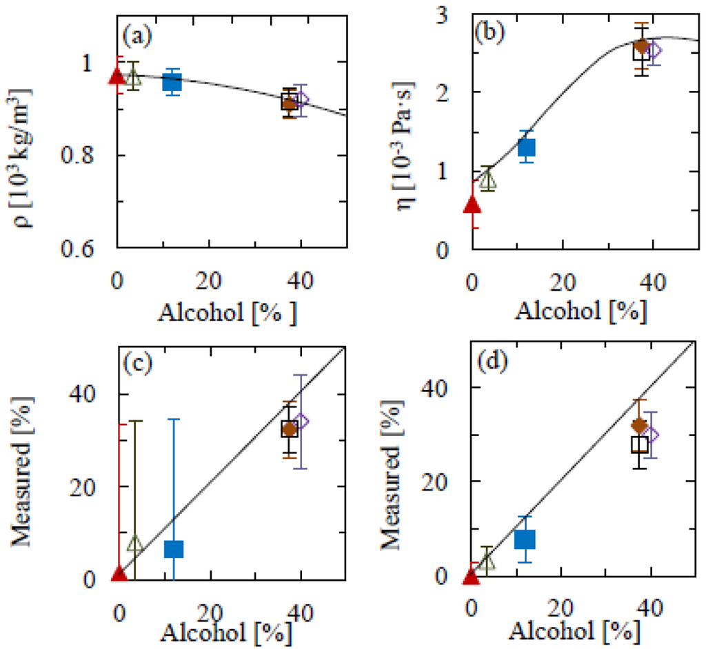 Figure 4 shows density and viscosity measurements for a range of drinks. These are: beer, non-alcoholic beer, white wine, vodka, whisky and gin. We then use these values to determine the alcohol content. Upon application to alcoholic drinks, we find a good agreement between experimental and interpolated water/ethanol solution values for density and viscosity. By comparing the thus determined rheological properties to values for ideal water-ethanol solutions as measured previously, we determine the alcohol percentage in the beverages, and find these in good agreement with the manufacturers' specifications (Figure 3). The alcohol content could be determined from the mass density and from the viscosity separately, though the uncertainties are such that the viscosity is a far more accurate indicator of alcohol content for these beverages. Deviations from the expected values could be due to the interplay of other components within the drink, for example glycerol content, of which ranges from 5–7 g/L in wine [], 0.9–2 g/L in beer [] and higher in spirits, where the alcohol percentage is greater.