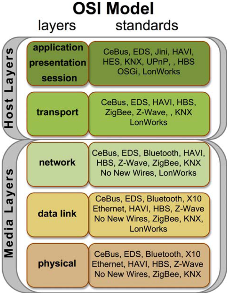 Moreover, some standards have been proposed with the intention of creating home networks, others with the sole purpose of managing them, so existing domotic network protocols can be classified according to the ISO/OSI model, which divides systems components according to the particular networking level at which they operate (physical, data link, network, transport and application). Thus, the KNX standard, which covers all network levels, is present in each level, while low-level standards, such as Bluetooth, are to the contrary found only in the lower levels. An example of such a breakdown is shown in Figure 1.