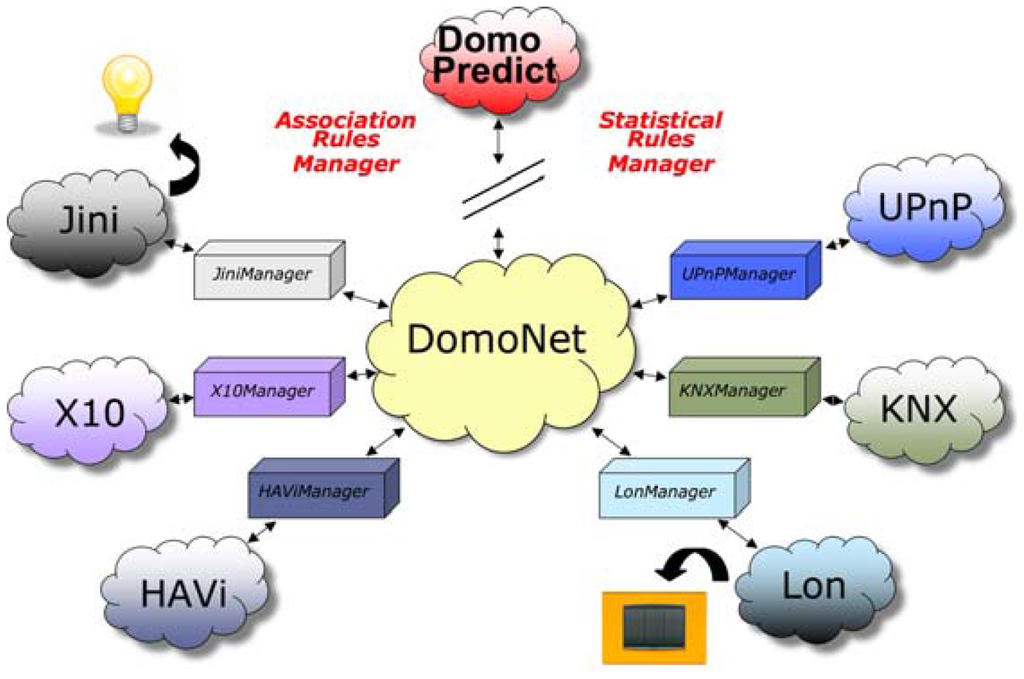 As shown in Figure 2 the AmI prototype DomoPredict [29] is a component of the DomoNet project, implemented, like all DomoNet clients, as an independent software client able to send commands and receive notifications of any state change in any domotic device through the DomoNet framework and the exchange of domoMessages.