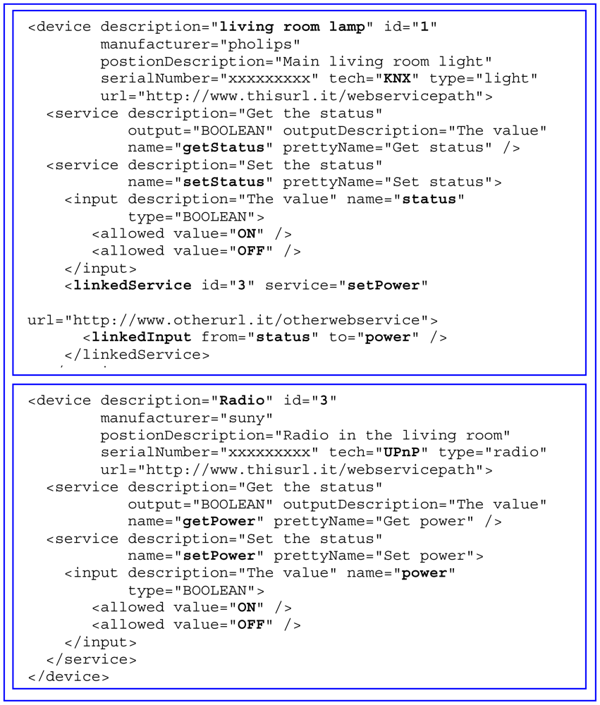 By way of example, Figure 3 shows a DomoML description of two devices that are to be made interoperable. The first is a living room lamp managed by KNX domotic technology. It offers two services: getStatus and setStatus, both of which take the boolean value ON/OFF (the former as output, the second as input). When the setStatus service is invoked, the system evaluates the linkedService tag, which indicates that the setPower service of the device with id = “3” is associated to the setStatus. The id = “3” refers to the UPnP-technology radio device, defined in the second device in the figure, with tag device description = “Radio”. The setStatus service has the internal variable status, whose value, assigned at the service call invocation, is copied into the input variable power of the UPnP Radio device's setPower service. The actual association is defined via the tag linkedInput of the setStatus service of the living room lamp device, thereby also achieving sharing of the state (ON or OFF) between devices belonging to different domotic technologies.