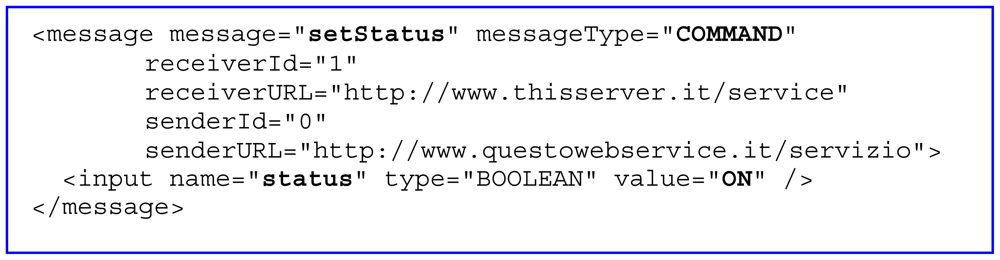 Figure 4 illustrates a message used to execute a command activating a device. The service invoked is setStatus of the device id = “1” (for example the living room light in the previous example), which sets the value of its input variable status to ON. The message will then be read and interpreted by the relevant TechManager, which translates it into the specific language of the device's domotic technology. The TechManager then sees to forwarding the message to the command target device, according to the rules and format of the specific domotics system. To communicate the outcome of the command to be executed, the system produces a feedback message of either success or failure. In the event that the user manually activates the device, the relevant TechManager recognizes the event and consequently produces and broadcasts a message identical to the previous one, but with the message tag attribute messageType set to the value UPDATE. Then domoNetWS identifies it and finds the properly configured device and service in order to execute the corresponding action (e.g., turn the light on).