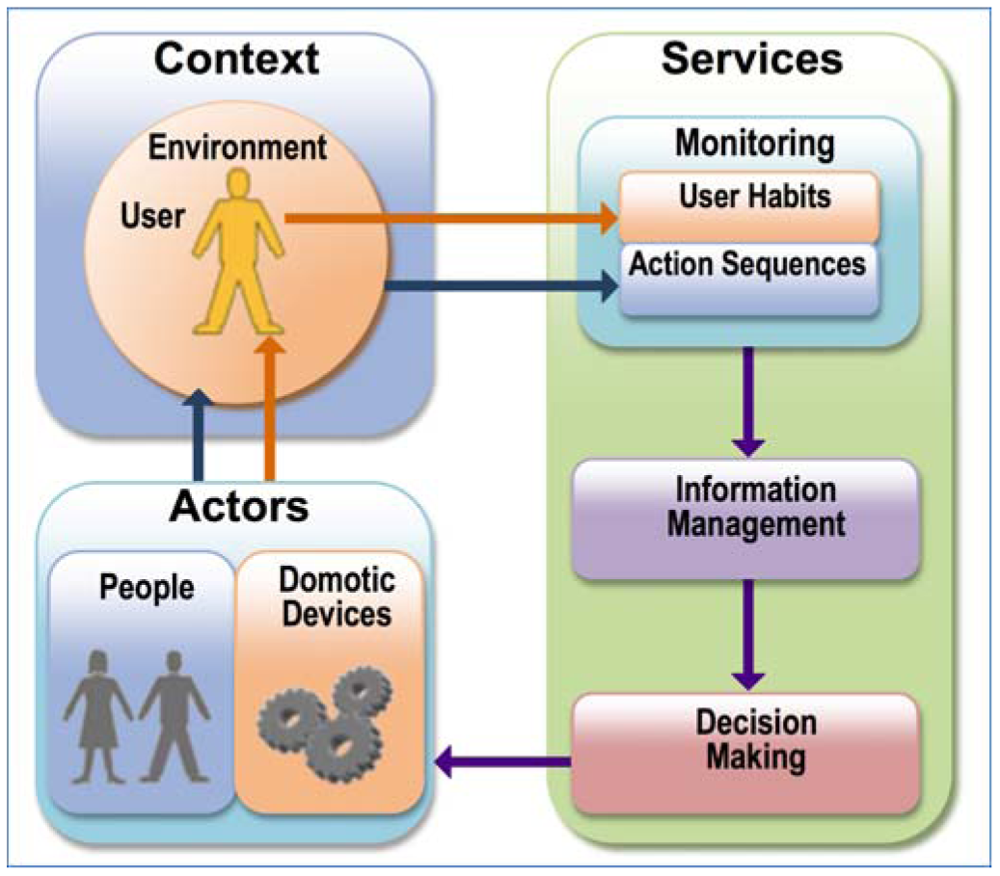 The key idea underlying many Ambient Intelligence (AmI) projects and applications is context awareness, which is based mainly on their capacity to identify users and their locations. The actual computing capacity should remain in the background, in the periphery of our awareness, and should only move to the center if and when necessary. Computing thus becomes ‘invisible’, as it is embedded in the environment and everyday objects. The research project described herein aims to realize an Ambient Intelligence-based environment able to improve users' quality of life by learning their habits and anticipating their needs. This environment is part of an adaptive, context-aware framework designed to make today's incompatible heterogeneous domotic systems fully interoperable, not only for connecting sensors and actuators, but for providing comprehensive connections of devices to users. The solution is a middleware architecture based on open and widely recognized standards capable of abstracting the peculiarities of underlying heterogeneous technologies and enabling them to co-exist and interwork, without however eliminating their differences. At the highest level of this infrastructure, the Ambient Intelligence framework, integrated with the domotic sensors, can enable the system to recognize any unusual or dangerous situations and anticipate health problems or special user needs in a technological living environment, such as a house or a public space.1. Introduction