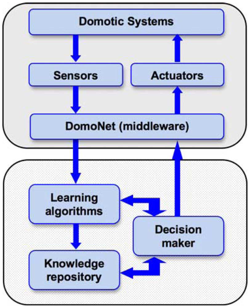 In particular (Figure 6), our AmI solution is based on the use of a set of sensors and actuators. Sensor output data are collected and analyzed by the DomoNet middleware, which reorganizes and uniformizes the information coming from the different domotic systems. Learning algorithms make a comparison between new input data and the knowledge repository. The learning algorithms' computations can enhance and improve the information stored in the knowledge repository. The Decision maker exploits the information stored in the knowledge repository and the data from the middleware in order to arrive at a ‘diagnosis’, and to automatically act, if needed, using the system actuators.