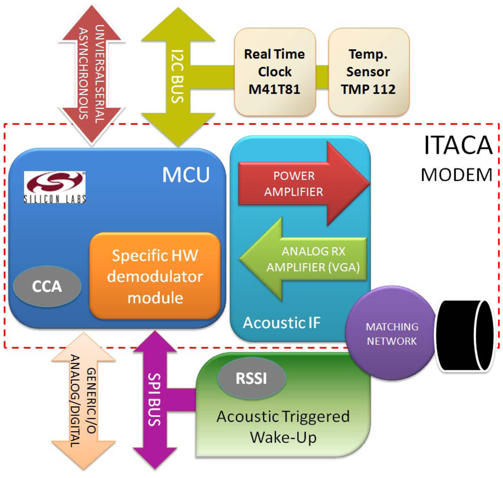 The first description of the ITACA modem was given in [13]. However, the design has been improved with enhanced features such as AAW-U, CCA, and RSSI measurement. ITACA architecture is built around a microcontroller (MCU) and several integrated peripherals that only consume 12 mW in normal operation and less than 3 μW in stand-by mode. Figure 1 shows the overall ITACA block diagram architecture.