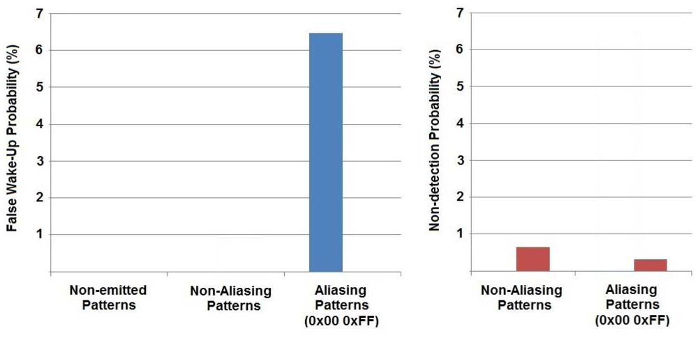 If all these aliasing patterns are avoided, the performance of the WU system increases. The worst case observed with non-aliasing was 0x88-bit array. No false wake-ups were reported but, in this case, non-detections occurred at a rate of 0.6% (Figure 11 non-aliasing column).