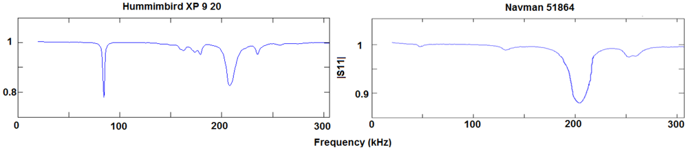 The the left-hand graphic shows that there are two identified bands around 85 kHz and 200 kHz (HUMMINBIRD device) that fit with the communication bands described. However, due to water attenuation, it is more worthwhile using the lowest possible frequency band: 85 kHz. In any event, the 200 kHz band is an alternative with more bandwidth and a more effective bit rate, and this should be taken into account for future designs that require a faster baud rate than 1 kbps. Some 300 ohms of pure resistive input impedance was calculated in the resonant frequency.
