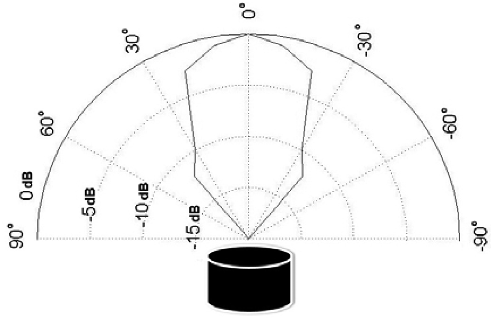 The Humminbird transducer has been characterized by measuring relevant parameters in this frequency band: transmitting sensitivity is 115 dB (re 1 μPa/V @ 1 m); receiving sensitivity is −154 dB (re 1 V/μPa @ 1 m) and the Humminbird transducer beam geometry is shown in Figure 3.