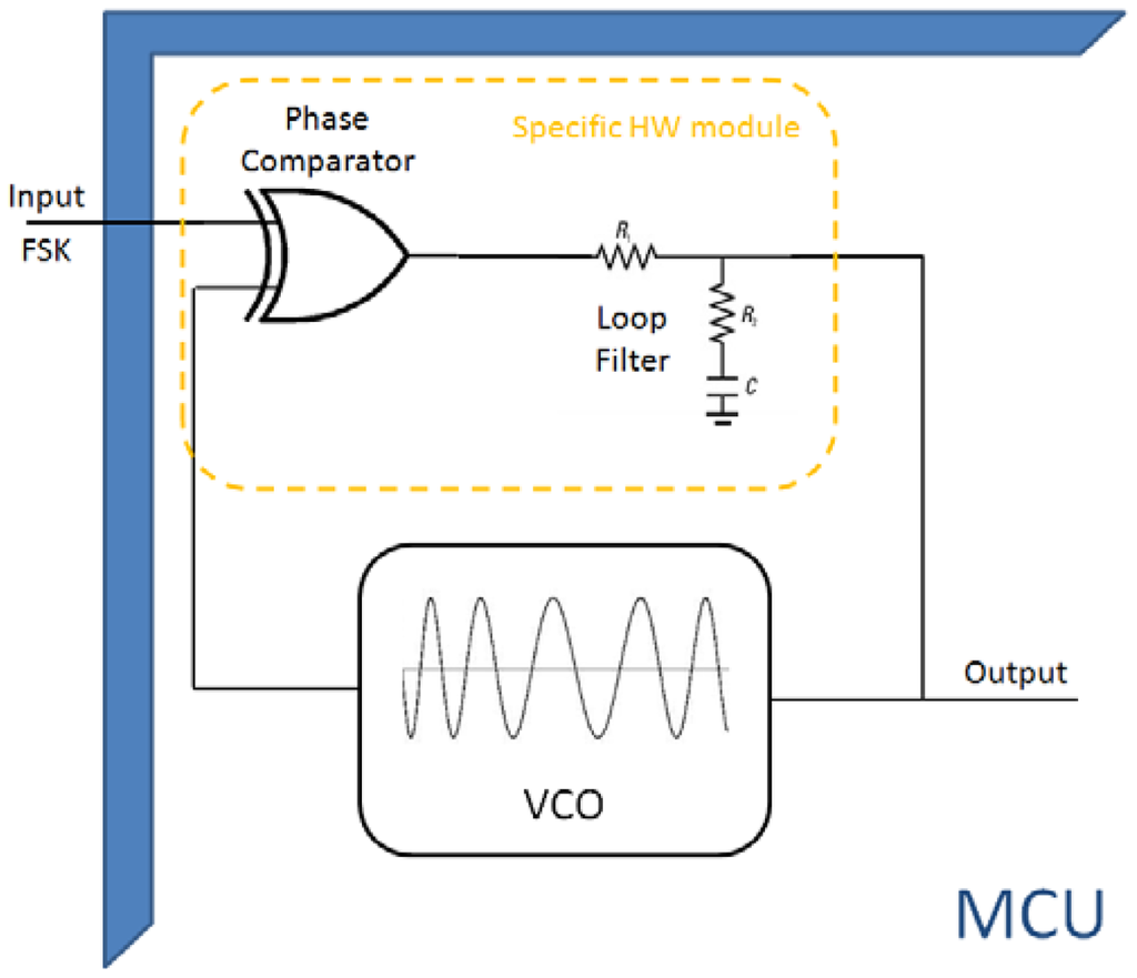 However, demodulation algorithms are more complicated because phase-locked-loop (PLL) is needed. Figure 4 shows the proposed block diagram demodulation system. It is formed of three main blocks: a phase detector; a low pass filter; and a controlled oscillator. When the loop is locked, the ‘output’ net provides the demodulated signal. The phase detector is based on an XOR gate and filtering in a lead-lag low-pass filter. It is an energy-efficient HW-SW solution because both the external phase detector and the low pass filter relieve the microcontroller from the most consuming tasks in demodulation. Because no multiply-accumulate unit is needed, ultra-low power microcontrollers can be used. For example, the inexpensive c8051f920 Silabs microcontroller [36] is an 8-bit-microcontroller that offers very low power consumption.