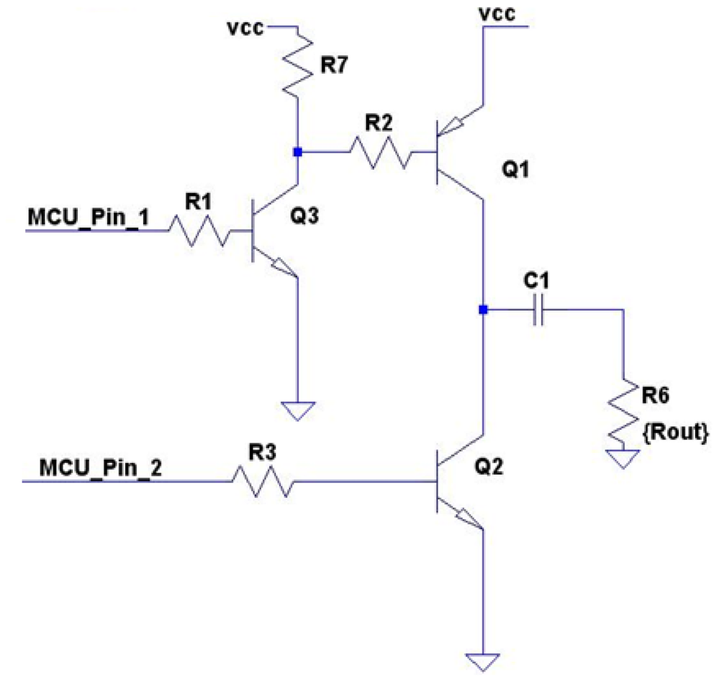 For that purpose, the amplifier shown in Figure 5 sets push-pull transistors that are independently activated or de-activated using two output pins on the MCU. The solution has been labeled as ‘push-pull class-B-based digitally controlled amplifier’ (D-PP-B). This architecture is especially suitable because harmonic distortion is not critical in frequency shift modulation applications.