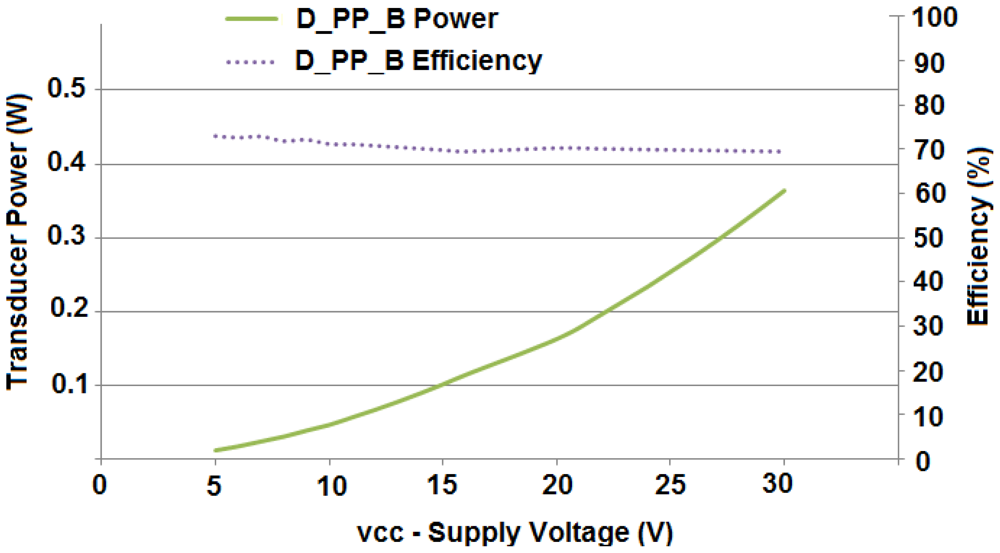 The transducer sensitivity values shown above reflect the relation between the voltage applied to the piezoelectric element and the acoustic wave pressure produced. The higher the applied voltage, the louder the acoustic wave that is produced and the longer the distances that it can travel. Figure 5 shows that the maximum peak-to-peak voltage (Vpp) that can be applied to the transducer may be changed by modifying DC supply voltage (Vcc). This feature can be tackled using variable output power management devices.